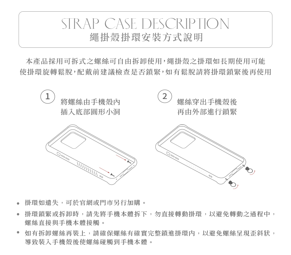 ⦿ 本品不含手機殼,僅含一組螺絲、掛環。
